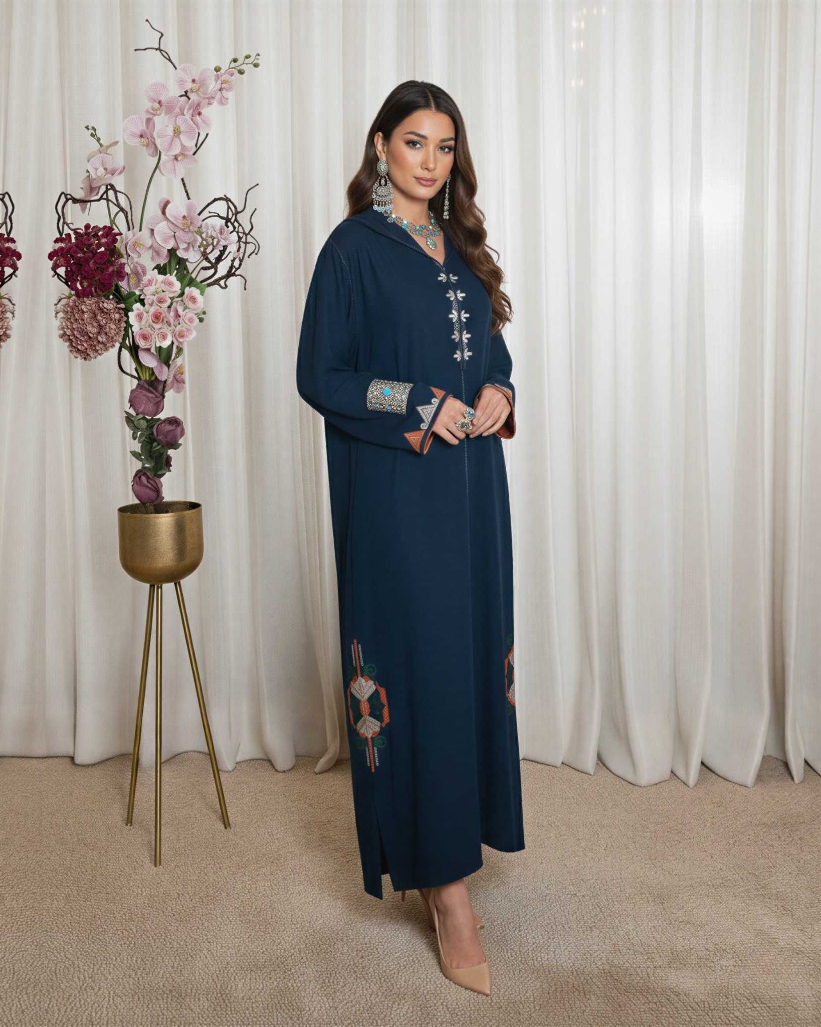 Intricate embroidery crafted by hand in our atelier, preserving Moroccan savoir-faire through every stitch.
